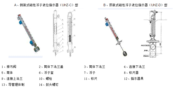 磁性浮子液位计材质 :| 产品名称 | 测装式指示器 | 顶装式指示器 |