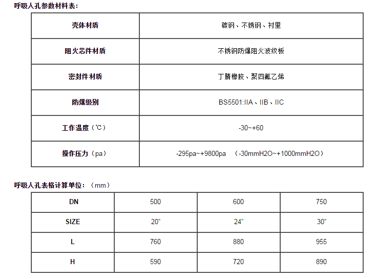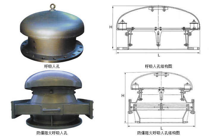 呼吸人孔、防爆阻火呼吸人孔是安装在储罐顶上的安全应急通气装置,通常与阻火呼吸阀配套使用,既能避免因意外原因造成罐内急剧超压或真空时,损坏储罐而发生事故,又能起到安全防火作用,是保护储罐的安全装置,特别适用于贮存物料以氮气封顶的拱顶常压罐。具有定压排放、定压吸入、开闭灵活、安全阻火、结构紧凑、密封性能好、安全可靠等优点。