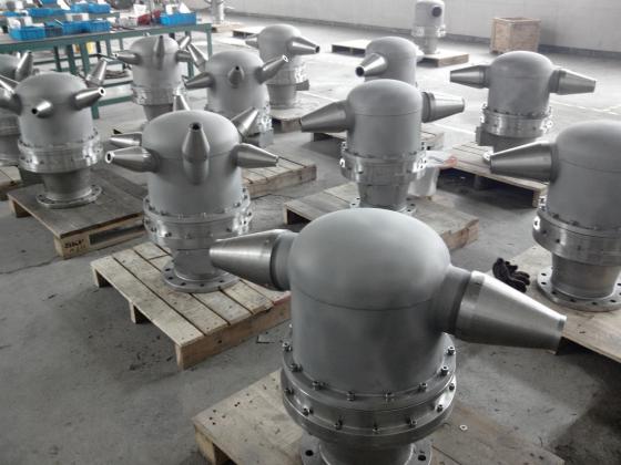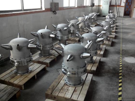 随位调合旋转喷头由喷嘴、集合管、旋转头、气囊、杠杆、法兰、螺栓等组成,材质为20#、Q235或不锈钢,旋转头为铝合金或不锈钢制造。随位调合旋转喷头制造尺寸根据油罐规格、油品种类、调合泵流量等参数进行设计,确定结构长度、角度。