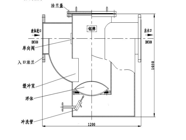 3、 当管道内油水混合时,进水通道、缓冲室与出水通道组成了水封,水从缓冲室下排出,而油从缓冲室上部回流。