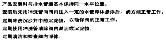 4、 当管道内无介质时,由于装置内保持一定的水位,装置内浮体处于常浮状态,使油品罐区内的水随时能正常排出。缓冲室内保持一定的水位,一方面是为了保证通道的正常开通,另一方面形成水封使排水通道在阀前后被水隔断可确保区域安全。