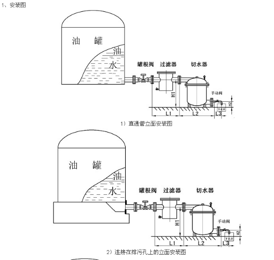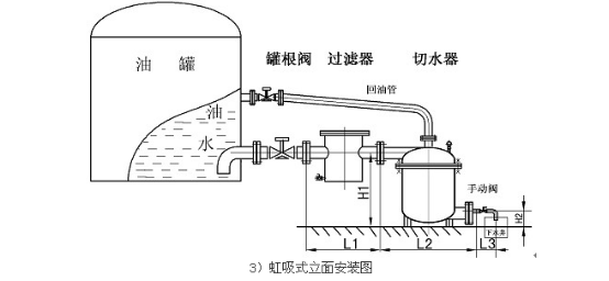 1、 本产品要求安装在平稳、坚固的地基上。进水口应平于或略低于油罐排水口。安装方式分两种:①不带虹吸管的油罐安装(参见图一、图二)。②带虹吸管的油罐安装(参见图三)